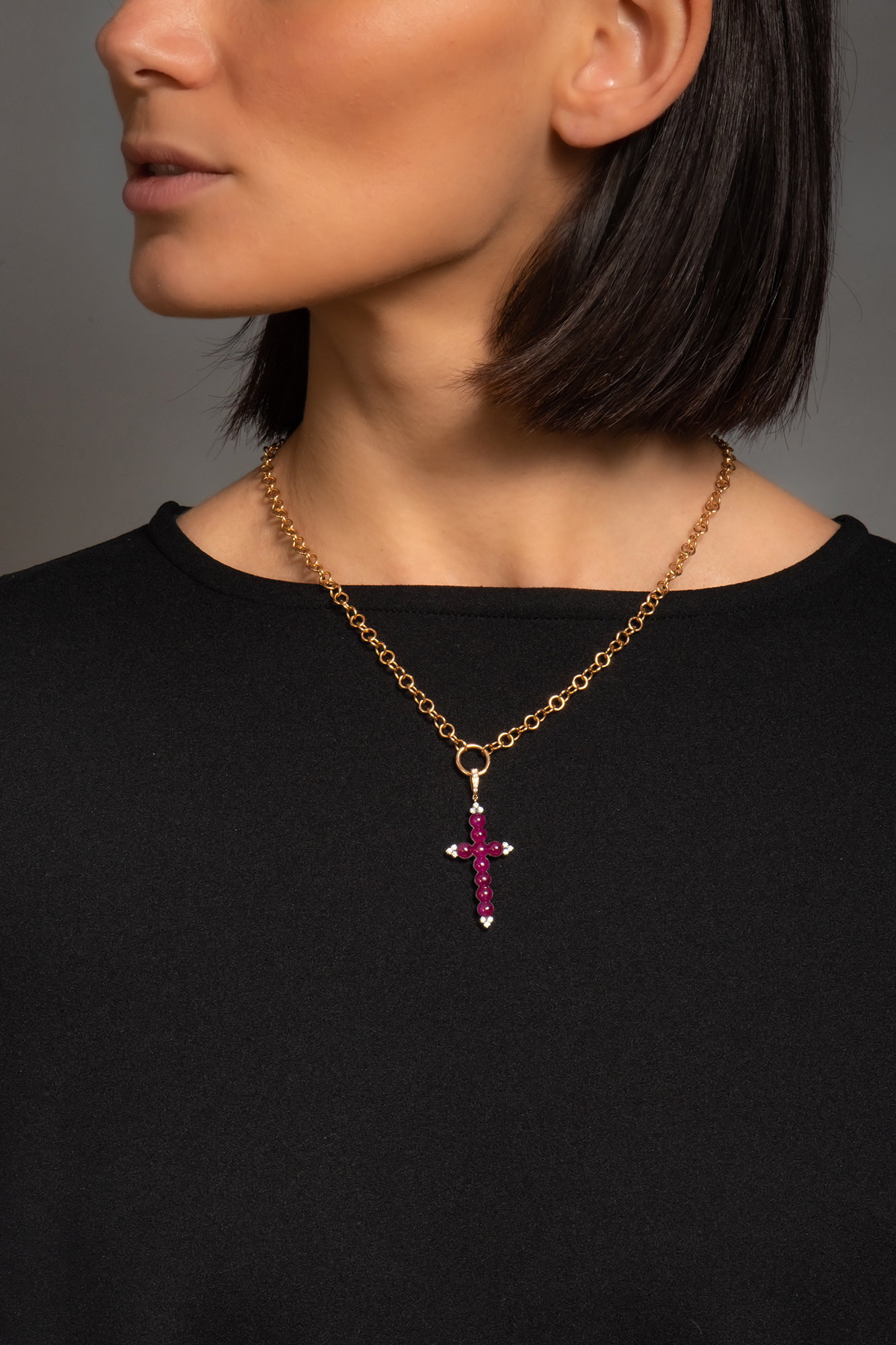 Busatti Cabochon Gold and Ruby Cross Necklace with Diamonds